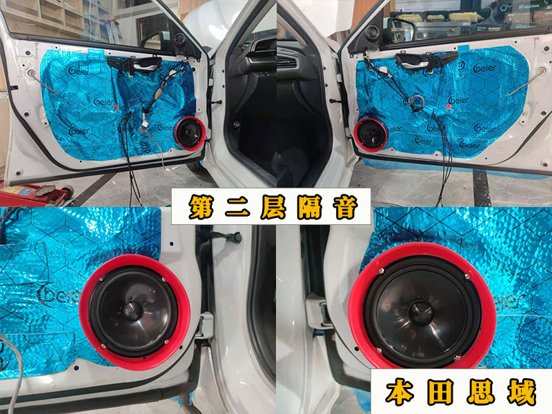 其中第一就是门板隔音,门板隔音是三层的,减少噪音的同时还能提升音质效果。第二层隔音贴完之后就可以安装喇叭了,都是使用专用的配件安装,无损的,思域后面的喇叭是在平台上的,后门是没有的,还有第三层的吸音棉可以降噪。